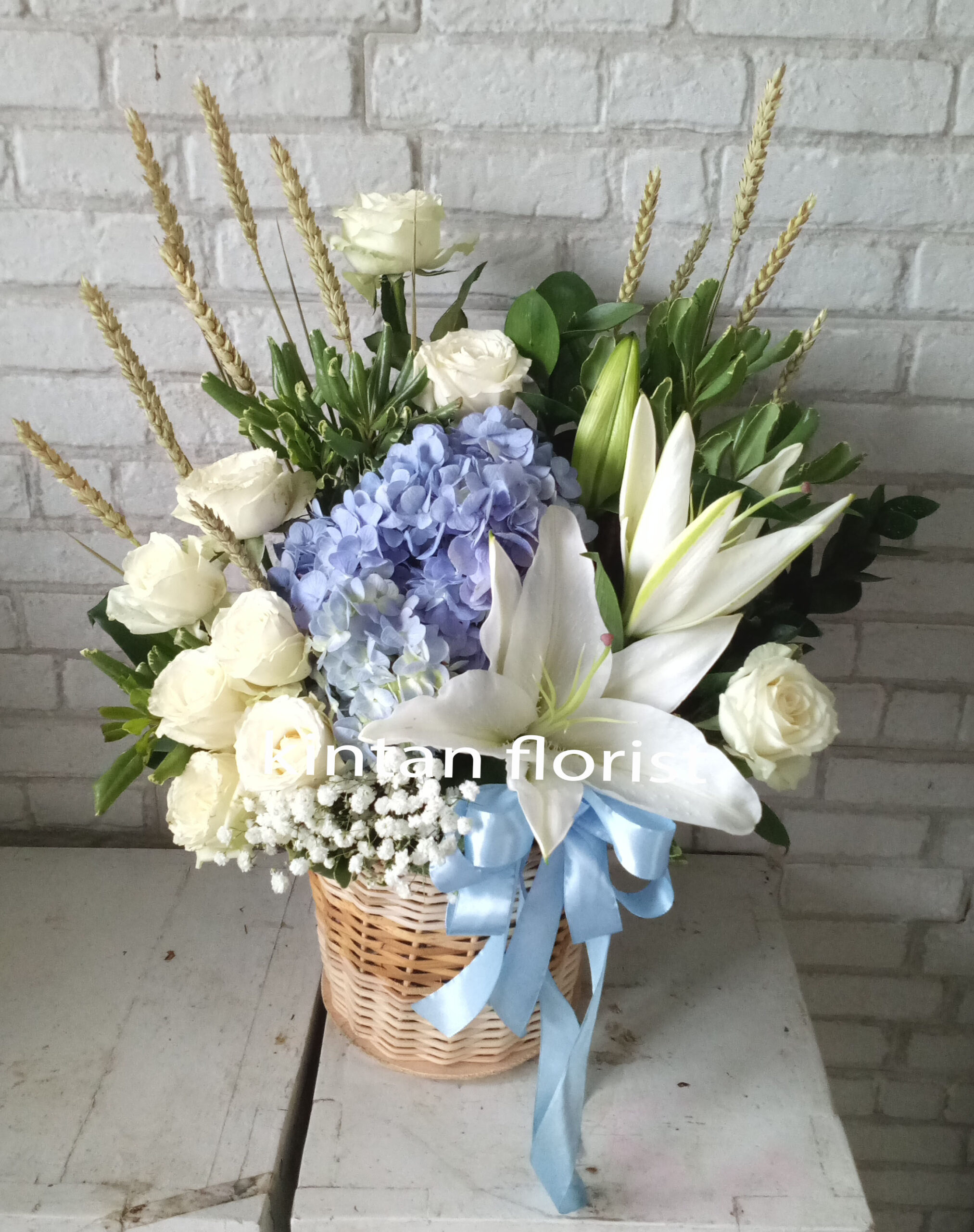 Home / Flowers in Boxes and Baskets / FB038FB038Rp475.000Arrangements of white roses, white lily, baby breath, blue hydrangeas, wheat flowers, leaves, in a basket vase FB038 quantity add to cart SKU: FB038 Category: Flowers in Boxes and Baskets Product ID: 2661