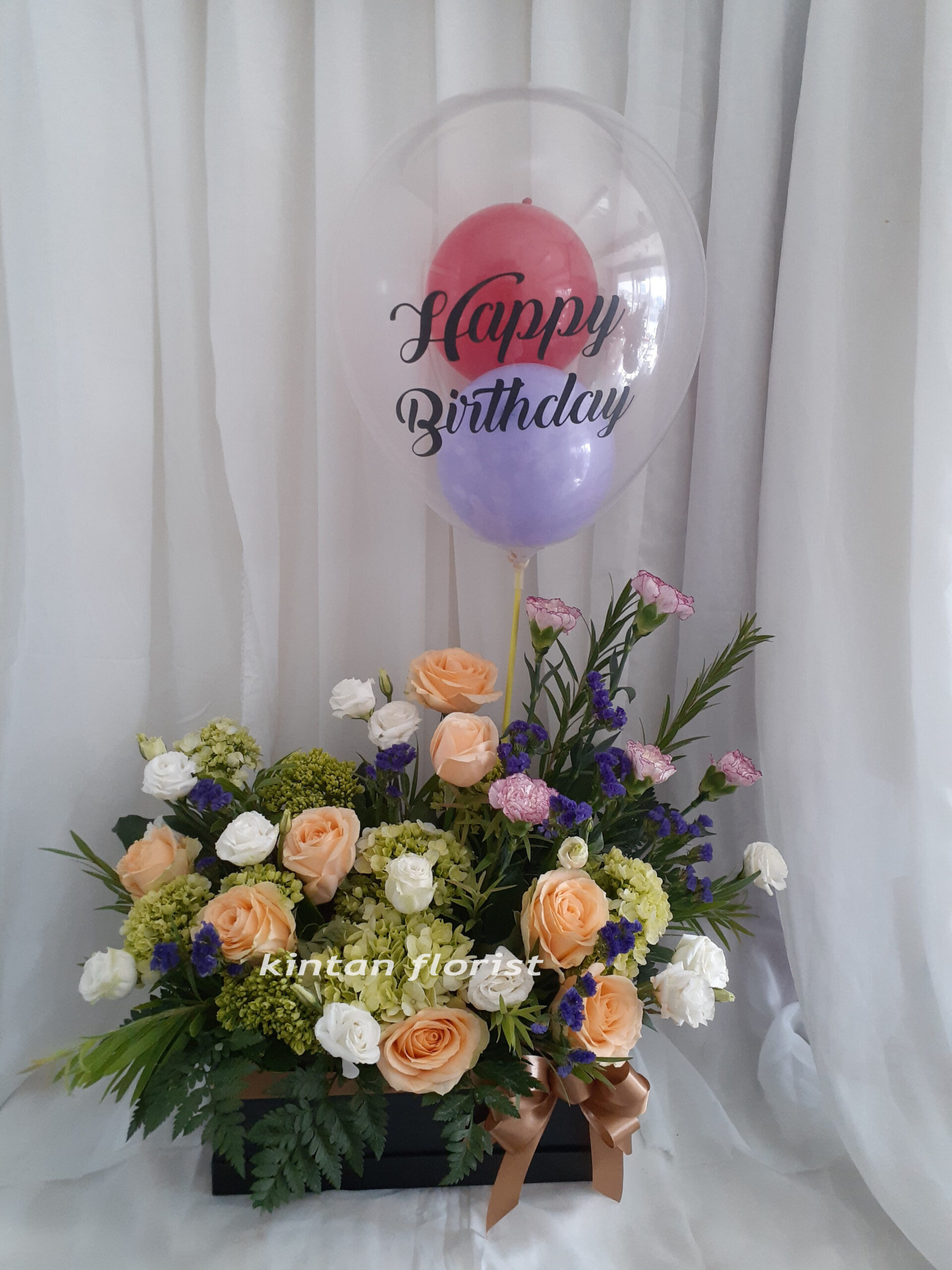 Peach rose arrangements, white lisianthus, carnation pink, purple statice, green hydrangeas, leaves, balloons in a box vase