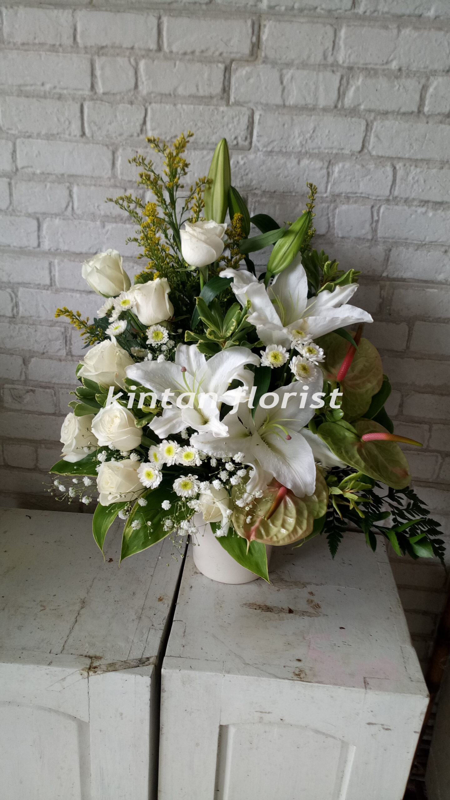 Home / Flower Arrangements / TB019TB019Rp300.000Arrangements of white roses, white lily, white chrysanthemums, anthurium, baby breath, solidago & leaves in a ceramic vase TB019 quantity add to cart SKU: TB019 Category: Flower Arrangements Product ID: 2514